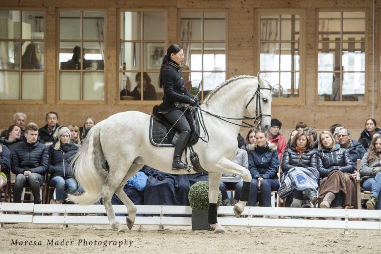 Nach einer Begrüßungsansprache von Prof. Dr. med. Volkmar Nüssler stellt Anja Beran mit Vera Munderloh die ersten Schritte unter dem Sattel mit dem Jungpferd Ferro, einem Barockpinto, vor. Der junge Hengst absolviert seinen ersten Auftritt vor großem Publikum tadellos, was auch an dem vertrauensvollen Umgang mit seinen Ausbildern liegt, die das junge Pferd niemals überfordern. Danach folgt Bayern-Hengst Diego da Silva, der einen weniger guten Start hatte, aber nun auf Gut Rosenhof schonend nach klassischen Grundsätzen gefördert wird. Diego arbeitet inzwischen schon sehr kooperativ mit unter seiner Reiterin Vera Munderloh und erste Piaffe- und Passageansätze lassen erkennen, welches Potenzial in diesem Warmblut-Hengst steckt. Dass vor allem schwierige Pferde von einer schonenden und respektvollen Ausbildungsarbeit profitieren, demonstriert Ausbilderin Christine Schmiedel mit der Vollblutaraberstute Patrizia. Die Stute ist zwar talentiert, aber charakterlich ausgesprochen schwierig und zeigt auch bei der Morgenarbeit erkennbare Probleme. Mit einer ruhigen Arbeit von logisch aufgebauten Übungen bringt Anja Beran Patrizia in körperliche und mentale Balance, was ihre anfängliche Nervosität spürbar senkt. Die Rassevielfalt bereichert Anja Berans Neuzugang aus Russland, der Achal Tekkiner Degni Shael. Degni ist ein ausgesprochen feines und elegantes Pferd, das sehr auf seinen Reiter fixiert ist. Nachdem Degni als Jungpferd, bevor er auf Gut Rosenhof kam, schon Erfahrungen auf der Rennbahn sammeln konnte, wird er nun – wie alle Pferde im Stall von Anja Beran – schonend nach klassischen Grundsätzen ausgebildet. Degni gibt sich dabei sehr lernwillig und talentiert. Auf der Morgenarbeit kann Vera Munderloh nicht nur seinen traumhaften Galopp zeigen, sondern auch erste Traversalen und Ansätze zur Piaffe und Passage. Degnis Markenzeichen ist auch sein „Russischer“ Schritt, wie wir ihn spaßeshalber nennen, denn der Achal Tekkiner wirft seine Vorderbeine im Spanischen Schritt fast bis über die Ohren hoch. Den Abschluss macht der Lipizzaner Favory Toscana, der bereits weit ausgebildet in den Lektionen der Hohen Schule glänzen kann.