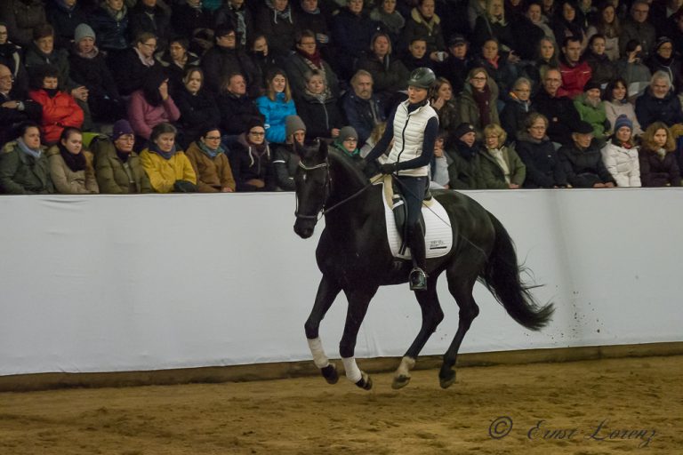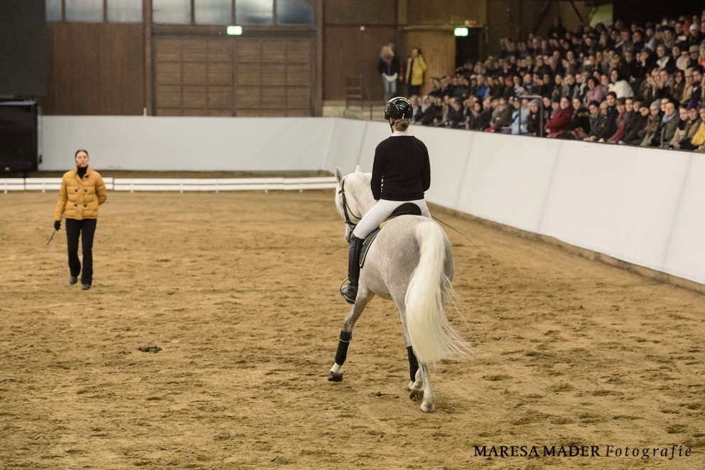 Insgesamt sechs Pferde hatten Anja Beran und Team ins HLG Marbach mitgebracht. Zu Beginn des Praxisteils präsentierte Pferdewirtschaftsmeisterin Eva Steinbach die in Schwaiganger gezogene Landessiegerstute von 2014, Amazing Grace, eine Boston-Tochter aus einer Mutter von Rivero II. Ihrem Namen machte Amazing Grace alle Ehre, denn es ist eine Augenweide diese talentierte, wenn auch schwierige Stute in Aktion unter dem Sattel zu sehen. Zusammen mit der Bayernstute in der Bahn war der vierjährige Wallach Fürstenfeld unter Pferdewirtin Lena Lösche. Seinen ersten Auftritt vor großem Publikum absolvierte der hochgewachsene Rappe anstandslos. Mit von der Partie war natürlich auch der Marbacher VA-Hengst WM-Safi, der von seiner Reiterin Silvia Wimmer vorgestellt wurde. Obwohl es für den eleganten Schimmel eigentlich ein Heimspiel war, war ihm die Aufregung anfänglich anzumerken. Mit Ruhe, Konsequenz und mit seiner Ausbilderin Anja Beran am Boden präsentierte sich Safi dann doch routiniert und mit edler Ausstrahlung. Sogar einen Test-Applaus des Publikums überstand der junge Hengst nach einem kurzen Schreck gut an der Seite seiner Reiterin. Danach zeigte der gekörte Hengst Bailando von Boston, aus einer Mutter von Rivero II vom HLG Schwaiganger unter Eva Steinbach ebenso wie die vorigen Pferde, wie Jungpferde nach den Grundsätzen der klassischen Dressur laufen sollen: locker mit der Nasen VOR der Senktechten und dem Genick als höchstem Punkt! Der eigens mit seiner Frau an seinem Geburtstag angereiste Leiter des HLG Schwaiganger, Dr. Eberhard Senckenberg, war mit der Vorstellung seiner Pferde sichtlich zufrieden. Den krönenden Abschluss bot Publikumsliebling Haflinger Rudi mit seiner Besitzerin Susi Lobenhofer. Rudi zeigte, dass eine korrekte Piaffe und Passage nicht nur den Spezialisten vorbehalten ist. Anfänge einer Galopppirouette sowie die Basisarbeit in allen Seitengängen demonstrierte der robuste Halflinger vom alten Schlag mit Routine und großem Eifer. Eigentlich sollte der Lusitano-Hengst Novilunio unter Anja Berans ersten Bereiterin Vera Munderloh noch die Hohe Schule der klassischen Dressur zum Abschluss zeigen, aber der Hengst verletzte sich kurz vor Beginn der Aufführung in der Box so schwer am Kiefer, dass seine Reiterin ihn in die Klinik bringen musste. Doch Lusitanos sind hart im nehmen und so konnte Novilunio schon zwei Tage später wieder zurück auf Gut Rosenhof reisen und hat sich inzwischen vollständig erholt.